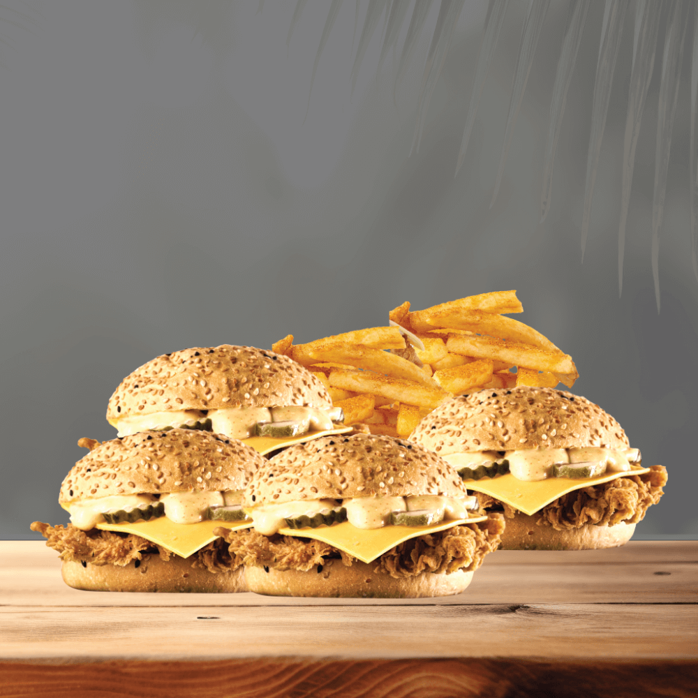 4 Crispy chicken cheeseburgers, 2 family fries.
