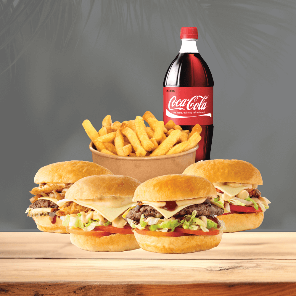 4 Orignal burgers choice of (crispy chicken or original beef.) 2 family chips 1.25ltr drink.