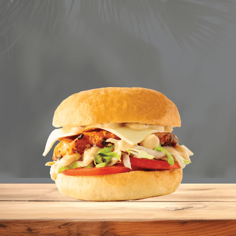 GF potato bun, marinaded grilled chicken breast, lettuce, tomato, cheese, secret sauce.