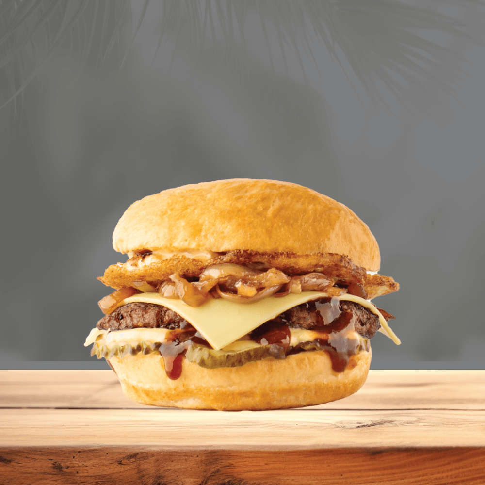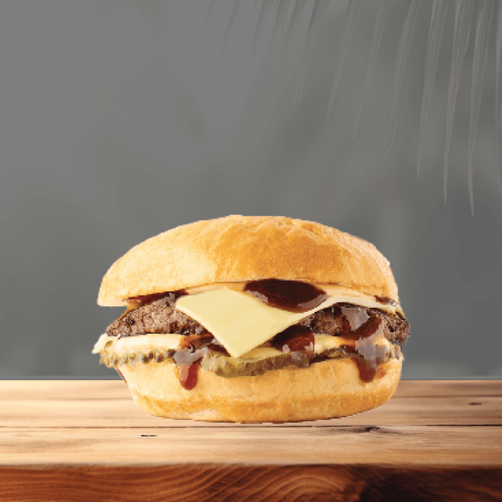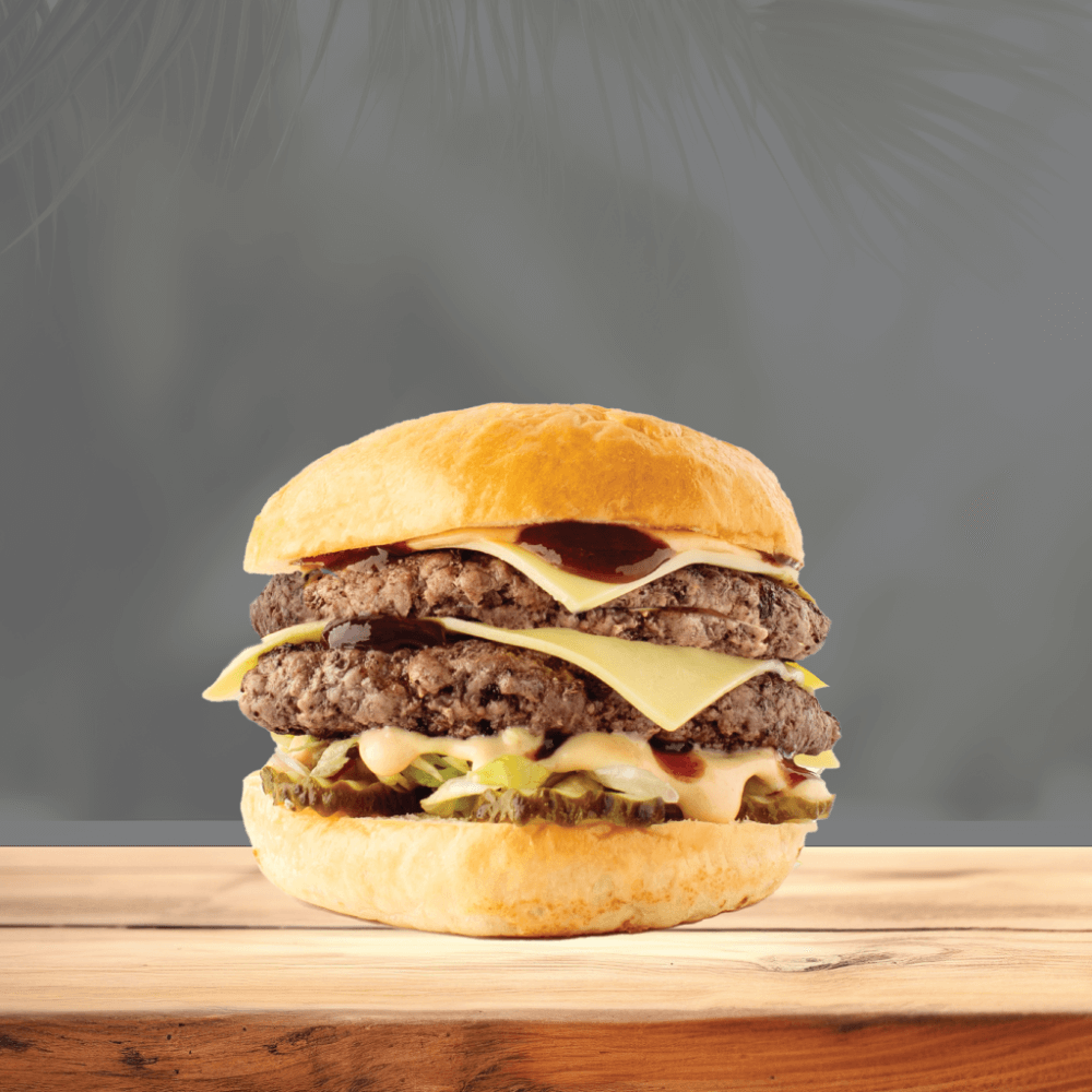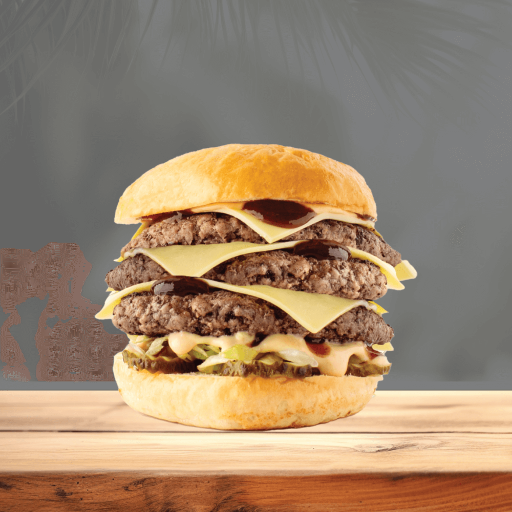 GF Potato bun, trippled smashed beef patty, tripple cheese, pickles, bbq sauce, secret sauce.
