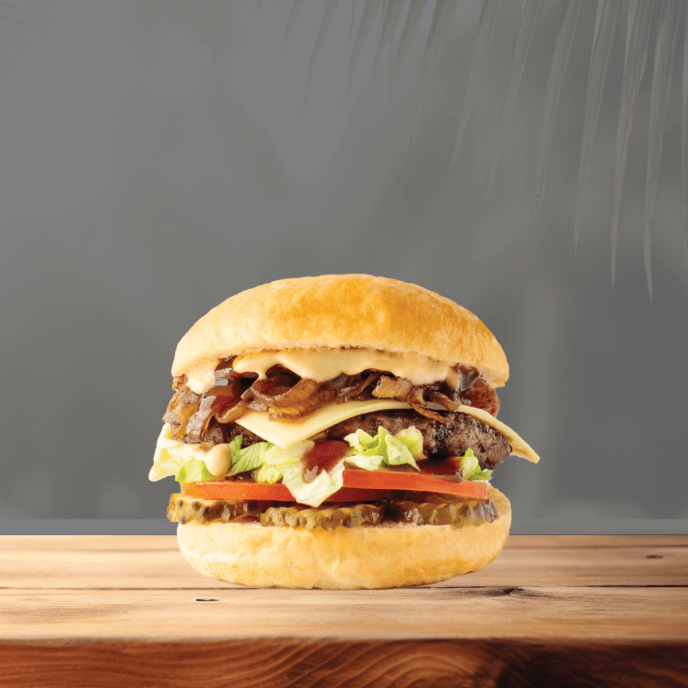 GF Potato bun, smashed beef patty, lettuce, tomato, pickles, beetroot, caramelised onions, salami, bbq sauce, secret sauce