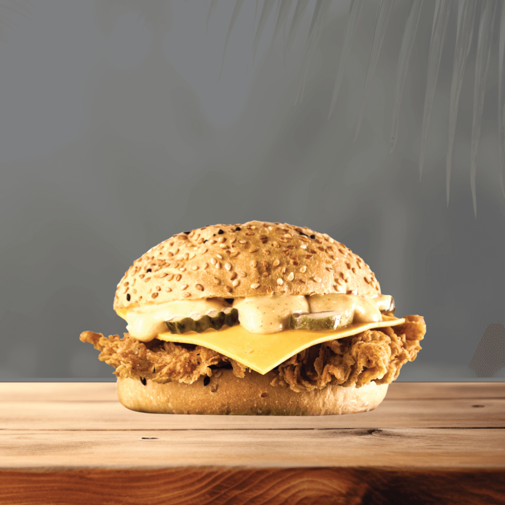 GF Potato bun, southern fried chicken breast, cheese, pickles, secret sauce.