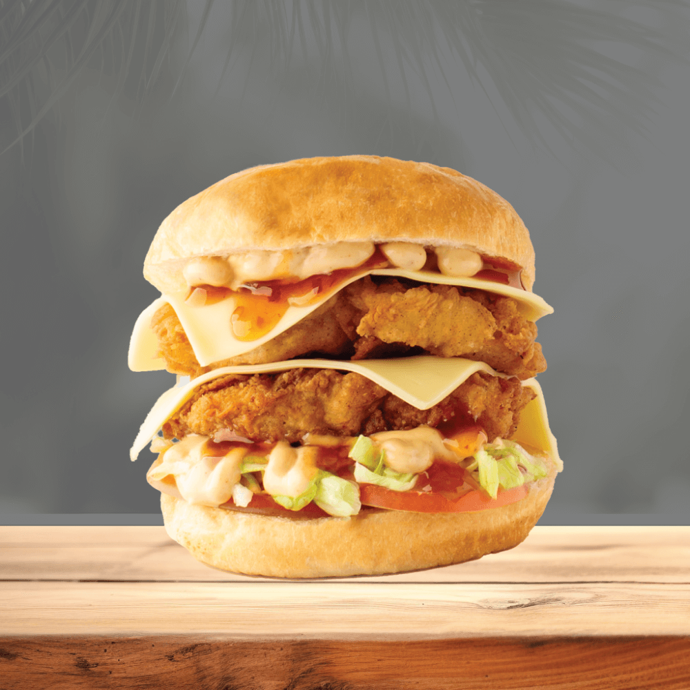 GF Potato bun, double southern fried chicken breast, lettuce, tomato, cheese, sweet chilli sauce, secret sauce.